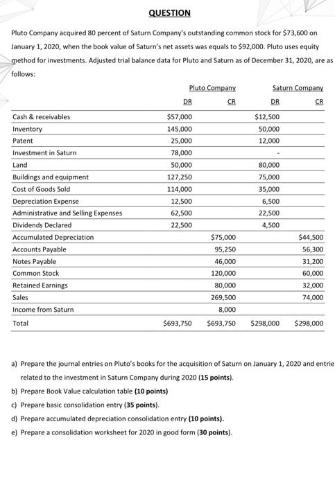 Solved Question Pluto Company Acquired 80 Percent Of Saturn Chegg Com